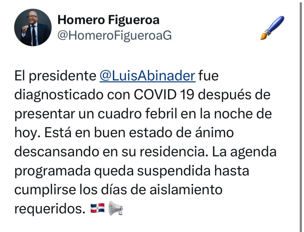 “El presidente Luis Abinader fue diagnosticado con COVID 19 después de presentar un cuadro febril en la noche de hoy. Está en buen estado de ánimo descansando en su residencia. La agenda programada queda suspendida hasta cumplirse los días de aislamiento requeridos”, explicó el funcionario en su tuit.