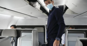Novak Djokovic se prepara para tomar asiento en un avión a Belgrado, en Dubái, Emiratos Árabes Unidos, el lunes 17 de enero de 2022. Djokovic fue deportado de Australia después de perder un intento de permanecer en el país para defender su título del Abierto de Australia. a pesar de no estar vacunado contra el COVID-19. El primer ministro Scott Morrison ...