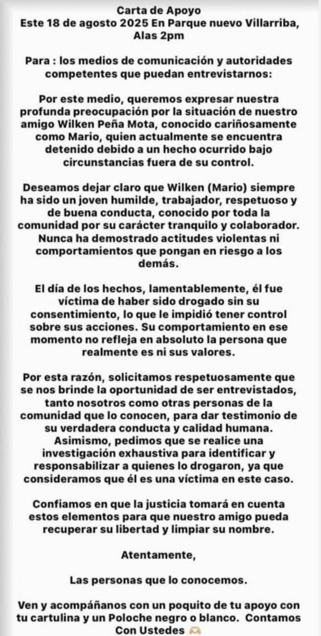Villa Riva.– Parientes, amigos y comunitarios del joven Wilken Peña Mota (alias Luis Mario) anunciaron una concentración para este lunes 18 de agosto, en el parque central de este municipio, con el propósito de manifestar su apoyo y exigir una investigación exhaustiva sobre el hecho en el que se vio involucrado.