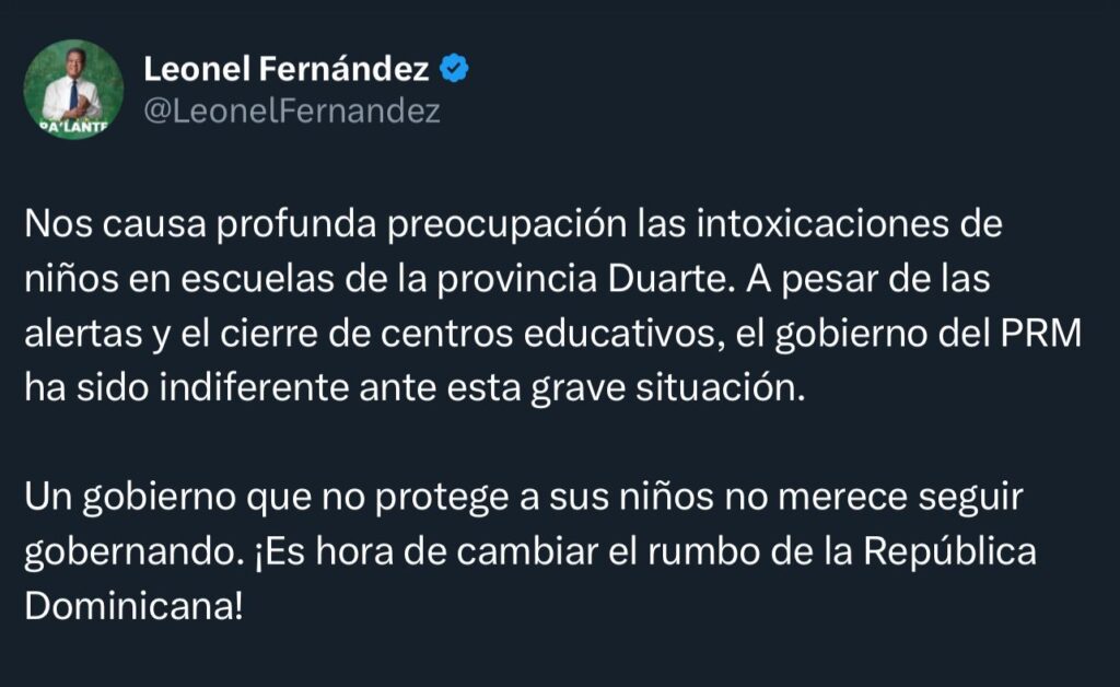 “Nos causa profunda preocupación las intoxicaciones de niños en escuelas de la provincia Duarte. A pesar de las alertas y el cierre de centros educativos, el gobierno del PRM ha sido indiferente ante esta grave situación”, expresó en su mensaje.