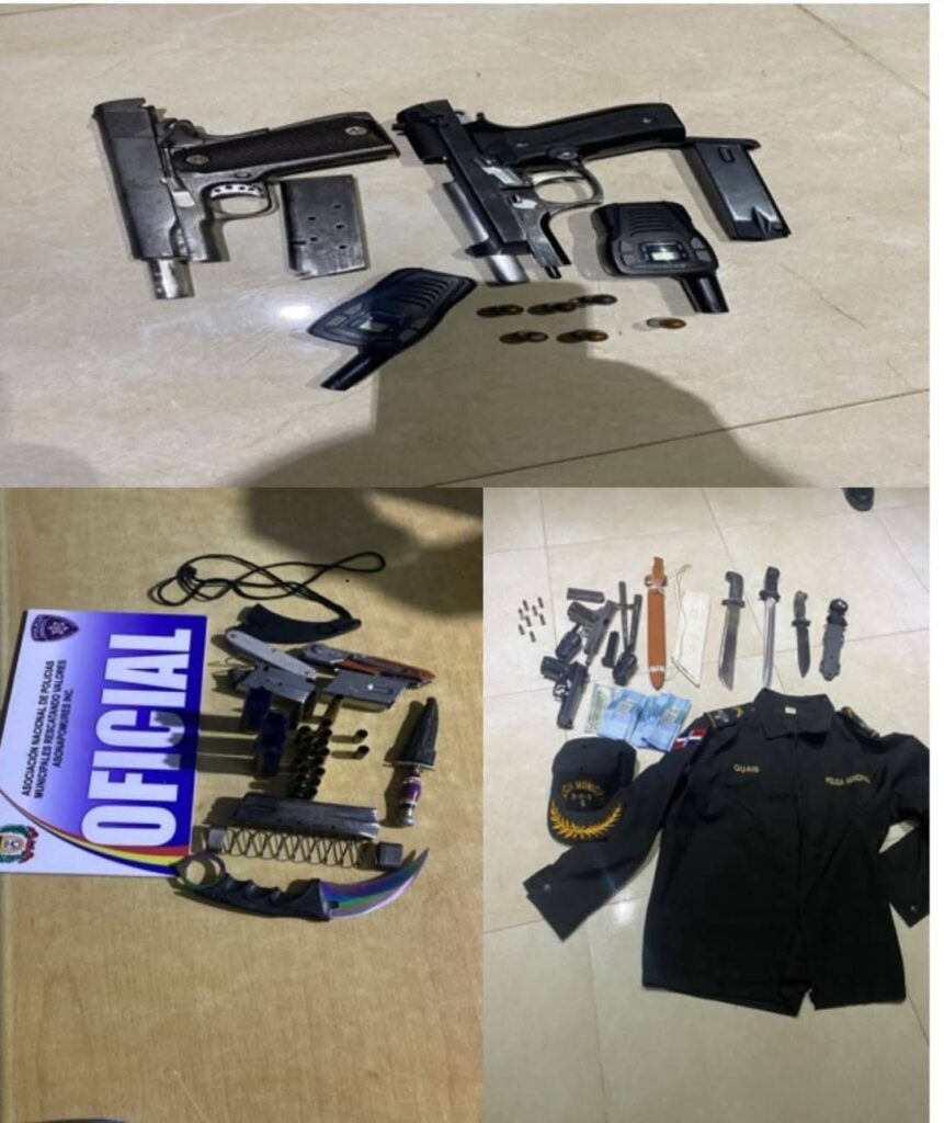 También se incautaron tres cuchillos y dos vaquetas. Se ocupó la suma de RD$160,000.00 en billetes de RD$2,000 y US$640 dólares. Además, se halló un abrigo negro con insignias de coronel de la Policía Municipal con el apellido “Ouais”, una gorra negra con el rango de coronel de la Policía Municipal, una placa de plástico de oficial y dos sevillanas.