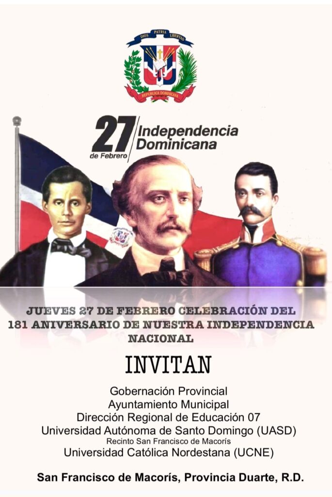 San Francisco de Macorís, R.D. – Este jueves 27 de febrero, diversas instituciones locales se unirán para celebrar el 181 aniversario de la Independencia Nacional Dominicana, con una serie de actos patrióticos organizados por la Gobernación Provincial, el Ayuntamiento Municipal, la Dirección Regional de Educación 07, la Universidad Autónoma de Santo Domingo (UASD) recinto San Francisco de Macorís y la Universidad Católica Nordestana (UCNE).