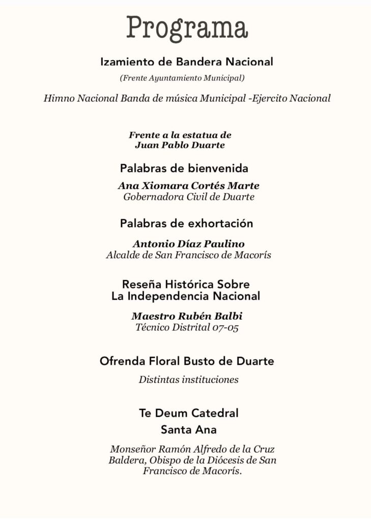El programa conmemorativo concluirá con un solemne Te Deum en la Catedral Santa Ana, encabezado por monseñor Ramón Alfredo de la Cruz Baldera, obispo de la Diócesis de San Francisco de Macorís.