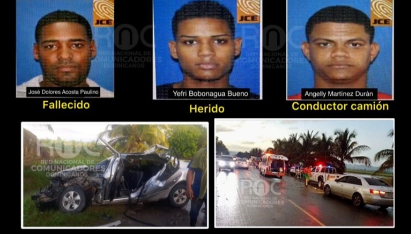 La colisión que involucra un carro Hyundai y un camión Mack, cobró la vida del joven José Dolores Acosta Paulino, conocido como Chelo, de 34 años y dejó lesionado a su compañero Yefri Bobonagua Bueno, de 23 años, quien fue trasladado por una ambulancia al Hospital Municipal de Arenoso y cuyo estado de salud se desconoce.
