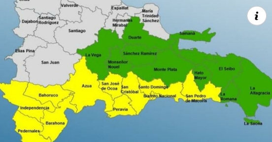 Las provincias en alerta amarilla son Barahona, San José de Ocoa, Santo Domingo, Pedernales, San Cristóbal, Distrito Nacional, Independencia, Peravia, San Pedro de Macorís, Azua y Bahoruco, mientras que en verde se encuentran La Romana, La Altagracia, El Seibo, Hato Mayor, Sánchez Ramírez, Samaná, Monte Plata, La Vega, Duarte y Monseñor Nouel.
