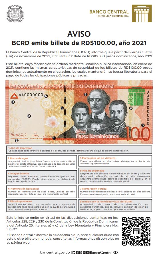 SANTO DOMINGO.- El Banco Central de la República Dominicana (BCRD), informó que un nuevo billete de 100 pesos estará circulando en el país a partir del próximo viernes 4 de noviembre de este año.