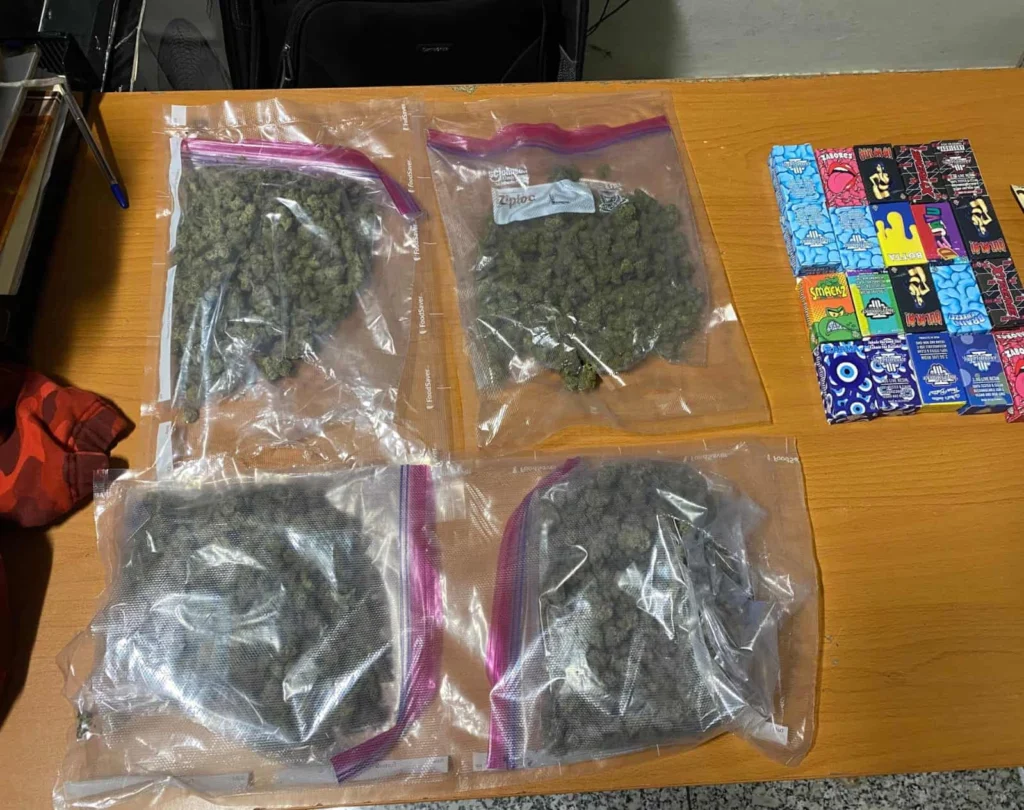 Con la presencia del fiscal, se procedió a revisar el equipaje, encontrando cuatro paquetes envueltos en fundas plásticas, dos porciones adicionales de la sustancia vegetal y 20 vaporizadores con líquido sospechoso.