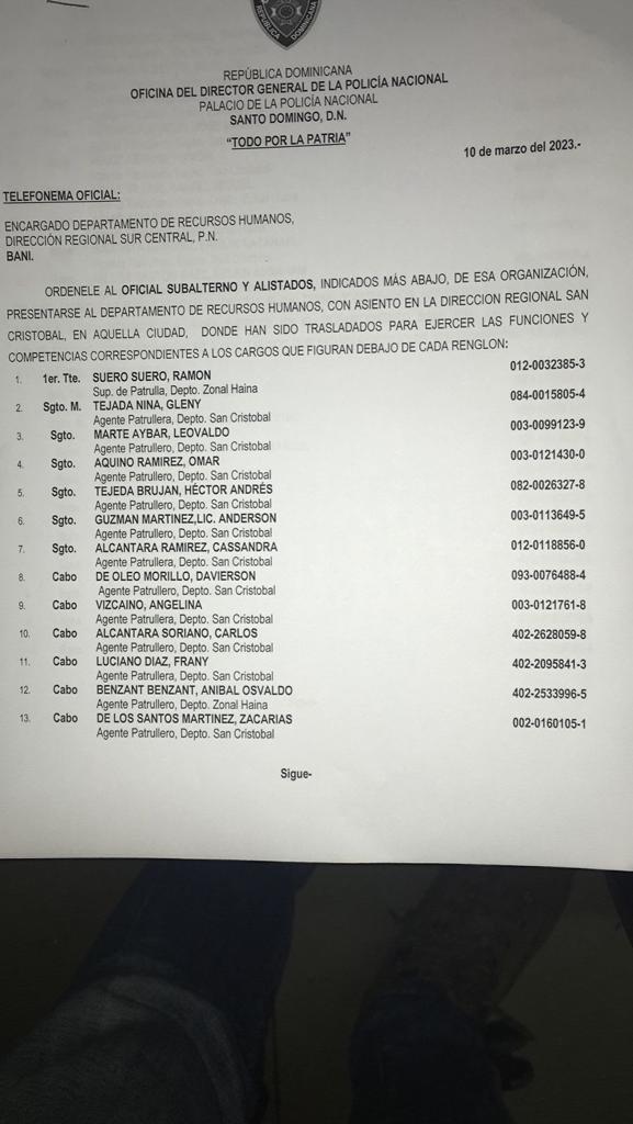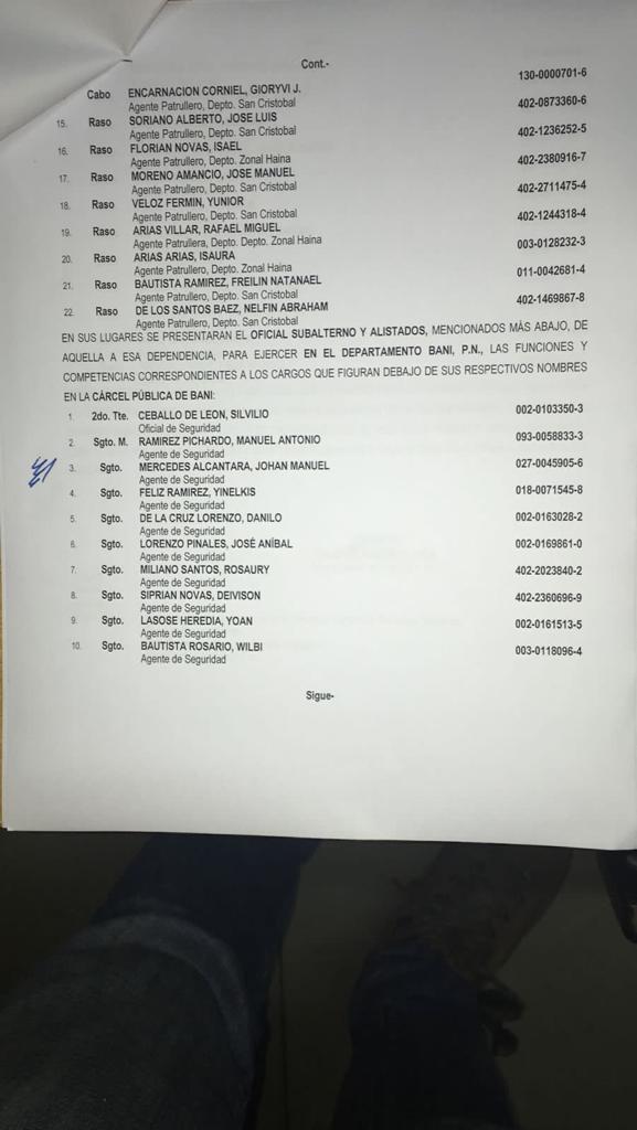 Santo Domingo.- El director de la Policía Nacional, mayor general, Eduardo Alberto Then, dispuso a través de la dirección de Recursos Humanos, que veinte (20) agentes y oficiales de la dirección regional de San Cristóbal, vallan a sustituir igual número que fueron traslados hoy de la cárcel de Baní.
