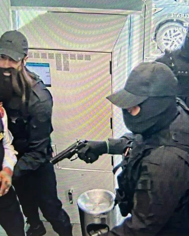 Mientras la yipeta maniobraba lentamente en reversa, los asaltantes sometieron al agente de seguridad y sustrajeron una cantidad no especificada de dinero de las cajas. A las 4:37 y 52 segundos, los ladrones salieron apresuradamente con el botín y abordaron el vehículo. La prisa fue tal que casi no lograron cerrar la puerta del vehículo en movimiento.