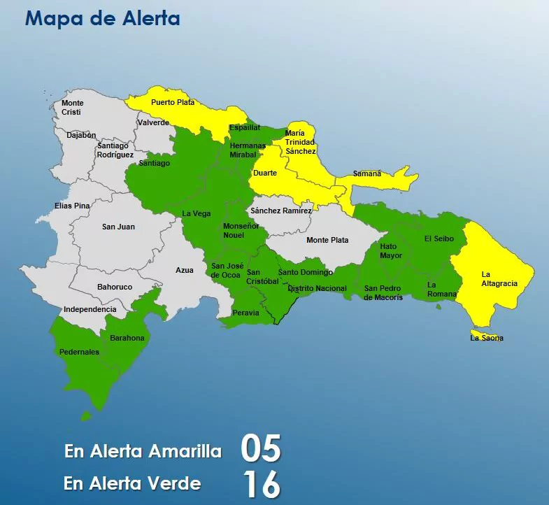 En virtud de lo anterior y lo establecido en el artículo 2 capítulo 1, de la Ley 147-02, sobre Gestión de Riesgos, este Centro de Operaciones de Emergencias (COE), amplia niveles de alerta, por posibles crecidas de ríos, arroyos y cañadas, así como inundaciones repentinas o urbanas, por lo que a partir de ahora regirán los siguientes: