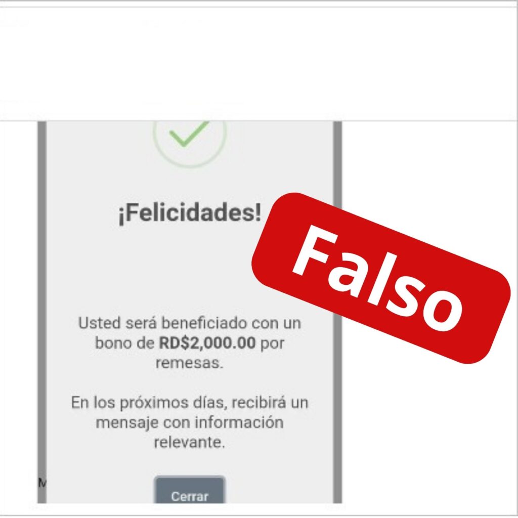 El falso mensaje dice “!Felicidades! Usted será beneficiado con un bono por de RD$2,000 por remesas. En los próximos días recibirá un mensaje con información relevante”.