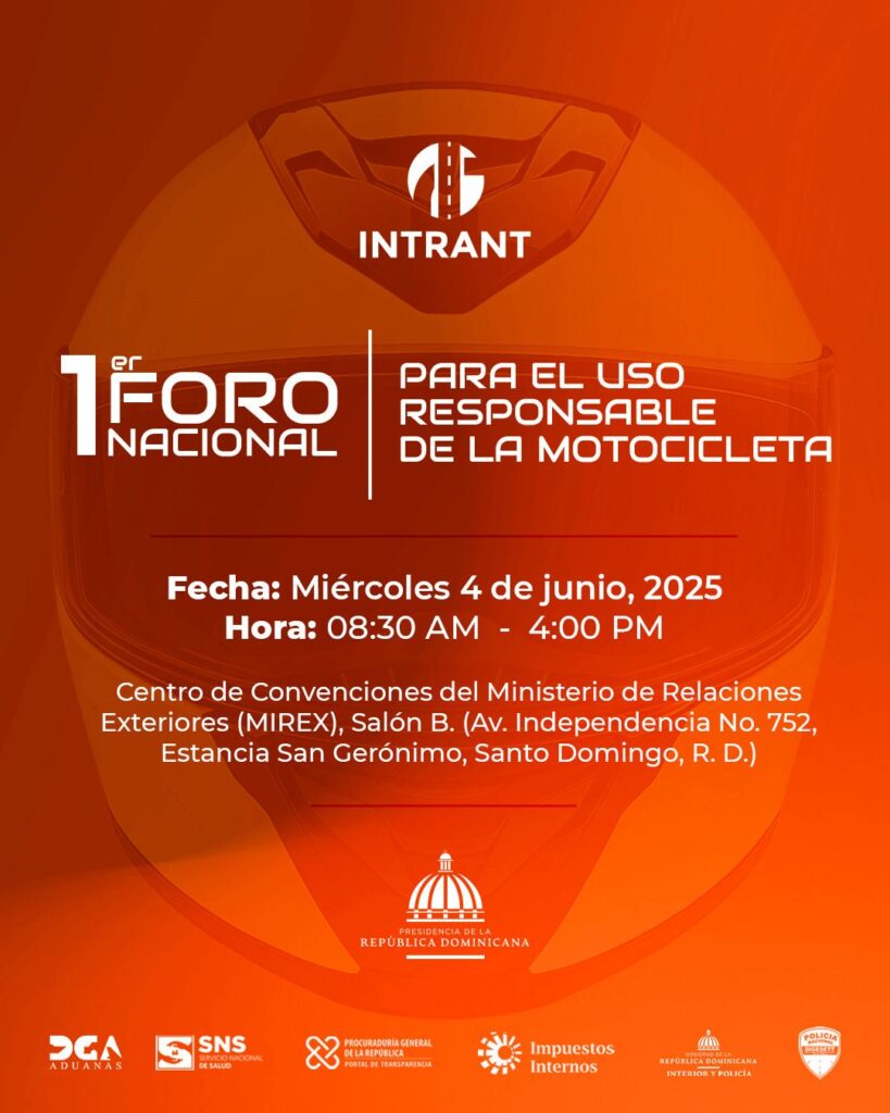 Santo Domingo.– El Instituto Nacional de Tránsito y Transporte Terrestre (Intrant) celebrará el “1er Foro Nacional para el Uso Responsable de la Motocicleta”, este miércoles 4 de junio de 2025, a las 9:00 de la mañana, en el Centro de Convenciones del Ministerio de Relaciones Exteriores.
