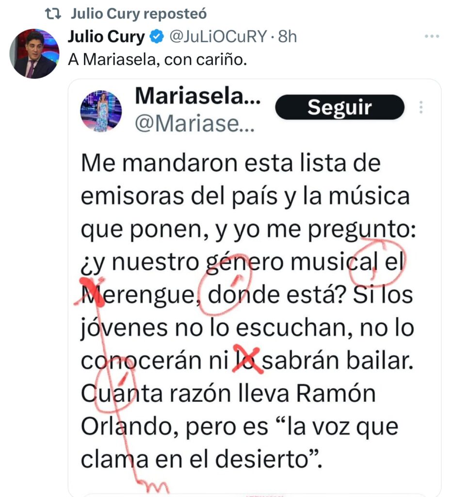 Julio Cury, uno de los juristas más prestigiosos del país, que se ha destacado por su profundo conocimiento de la gramática del idioma español, acaba de corregir un pots de la autoría de Mariasela Álvarez, con varias décadas en los medios de comunicación, orientando al pueblo dominicano, sobre diversas materias que aborda en su programa de televisión.