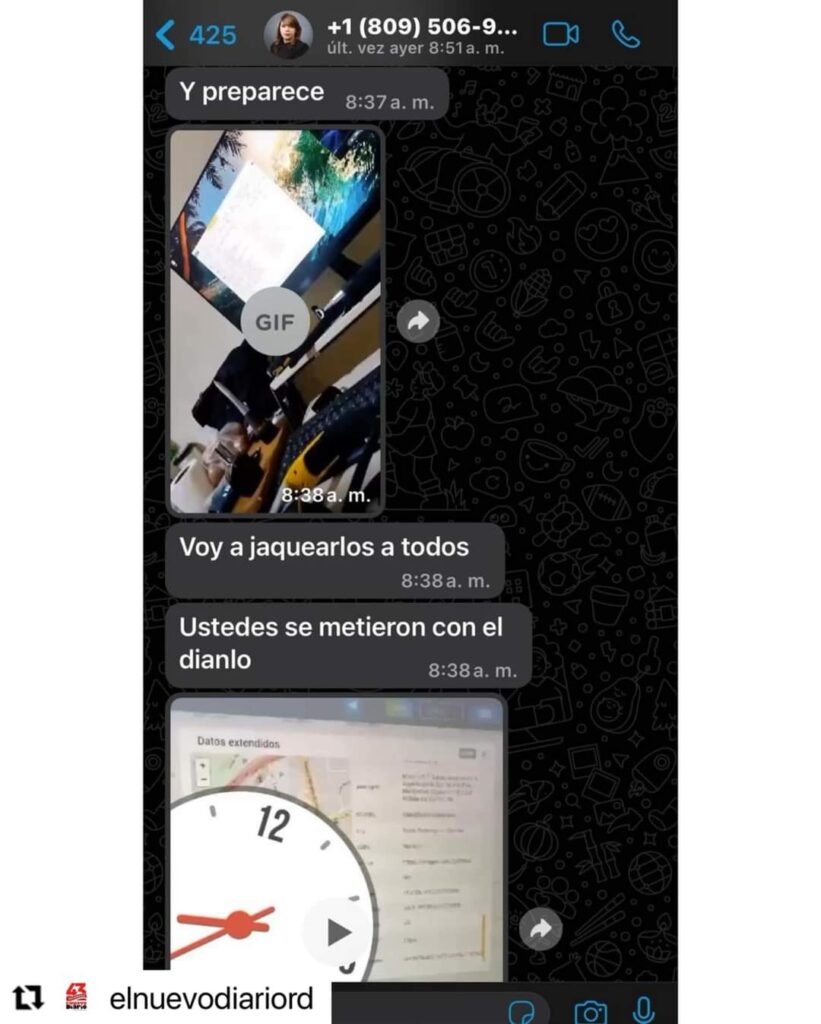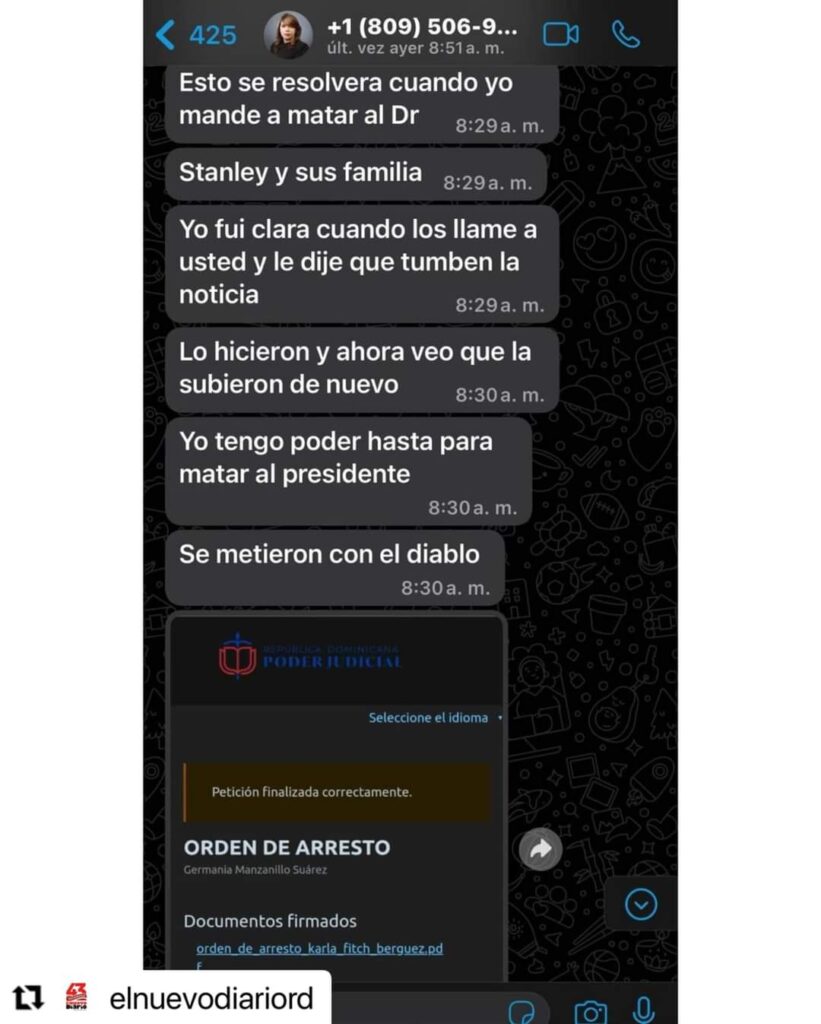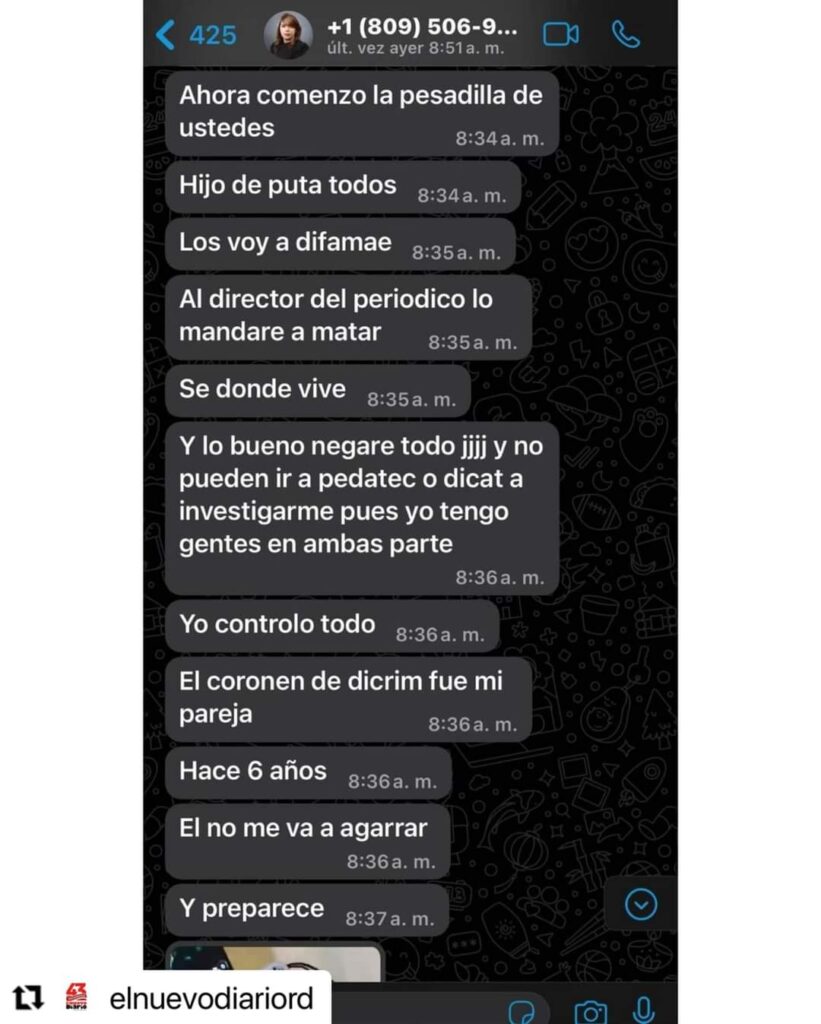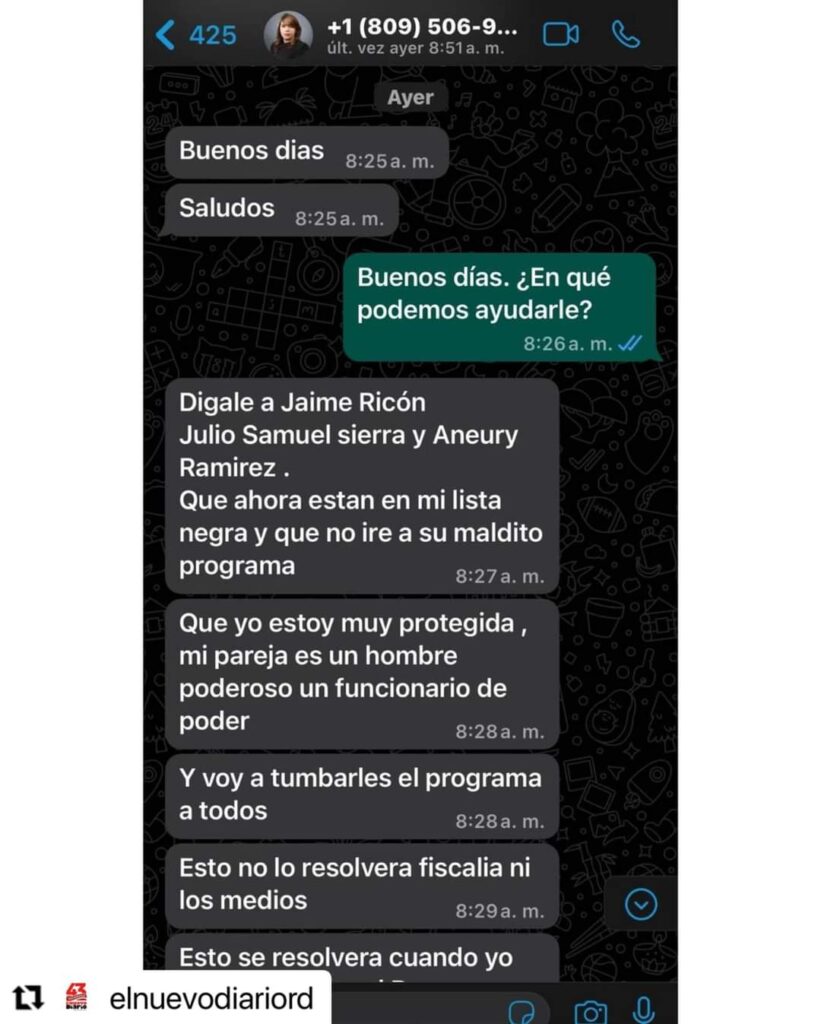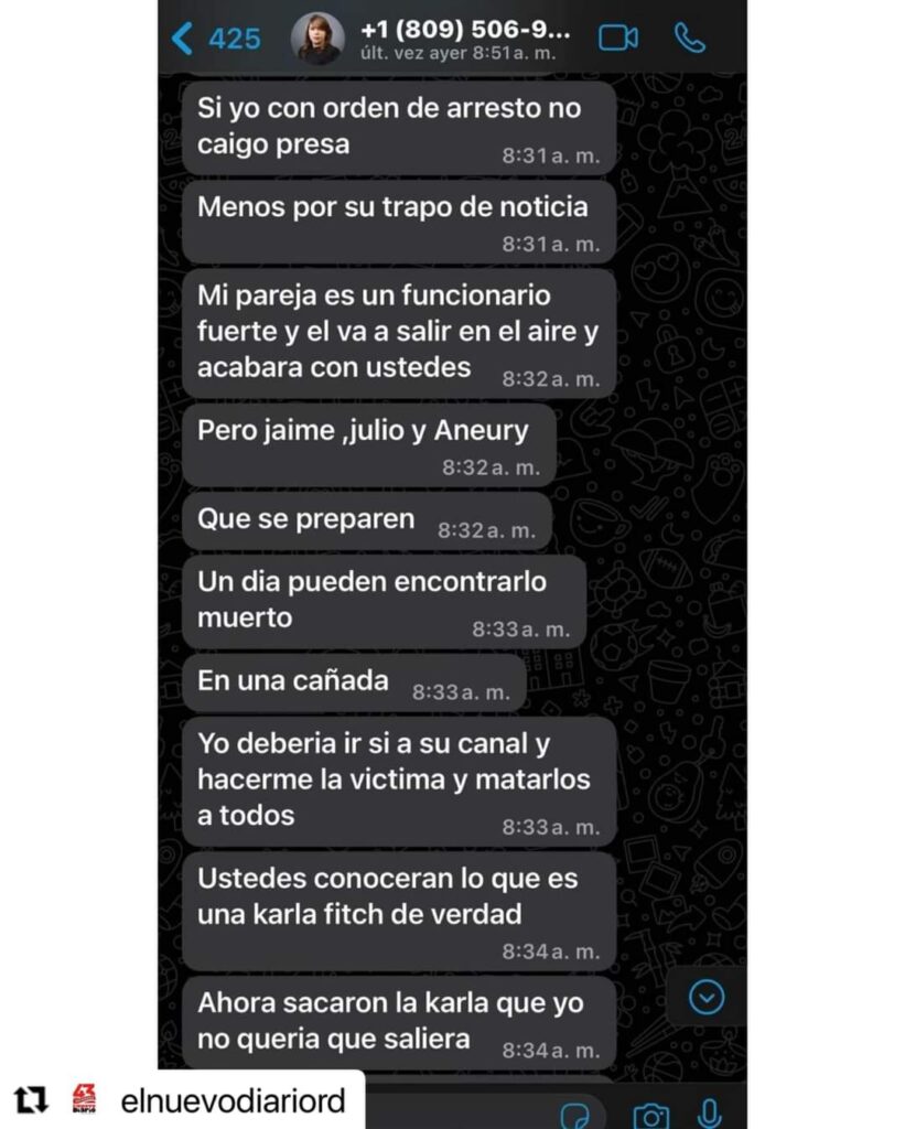 En mensajes enviados a través de WhatsApp, la mujer, quien se identificó como Fitch, lanzó amenazas específicamente al director del periódico y a los comunicadores Jaime Ricón, Julio Samuel Sierra y Aneury Ramírez, quienes forman parte del equipo del programa donde Stanley hizo la denuncia.