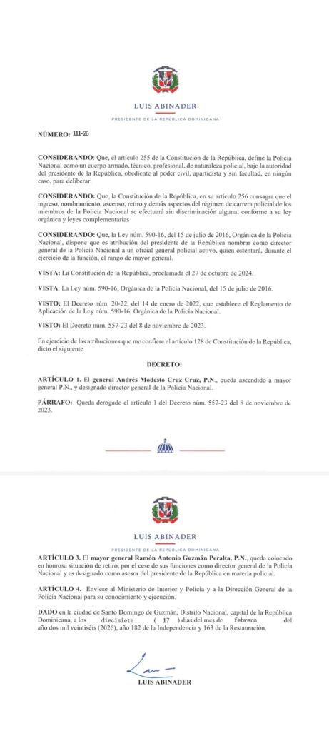 Santo Domingo, R.D. – El presidente de la República, Luis Abinader, dispuso el ascenso del general Andrés Modesto Cruz Cruz, P.N., al rango de mayor general y su designación como nuevo director general de la Policía Nacional, mediante el Decreto núm. 111-26.