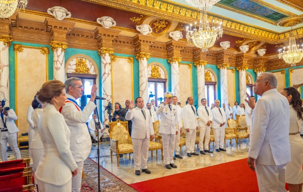 El Jefe de Estado, acompañado de la primera dama Raquel Arbaje y de la vicepresidenta Raquel Peña, tomó el juramento de los funcionarios, en un acto realizado en el Salón de Embajadores del Palacio Nacional, luego de ser investido con la banda presidencial en el Teatro Nacional Eduardo Brito que fungió como Asamblea Nacional.