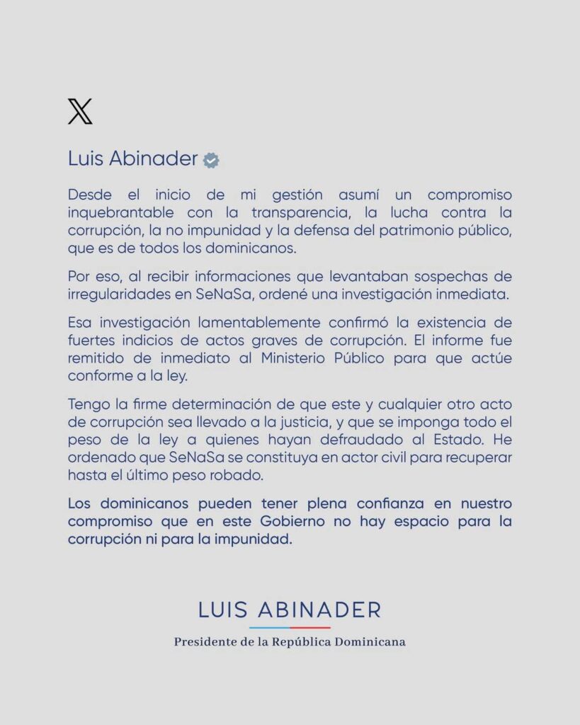 Santo Domingo.– El presidente Luis Abinader afirmó este domingo que la investigación realizada en el Seguro Nacional de Salud (SeNaSa) es una muestra clara de la determinación de su administración de actuar sin dilaciones ante cualquier señal de irregularidad y de garantizar que en su Gobierno no habrá casos de corrupción que no sean investigados a fondo.