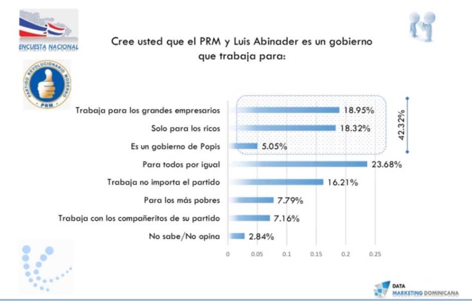 Santo Domingo.- La empresa encuestadora Data Marketing Dominicana dio a conocer su más reciente encuesta, donde revelan datos importantes sobre temas económicos, acciones del Gobierno, posiciones de los partidos políticos y líderes dominicanos.