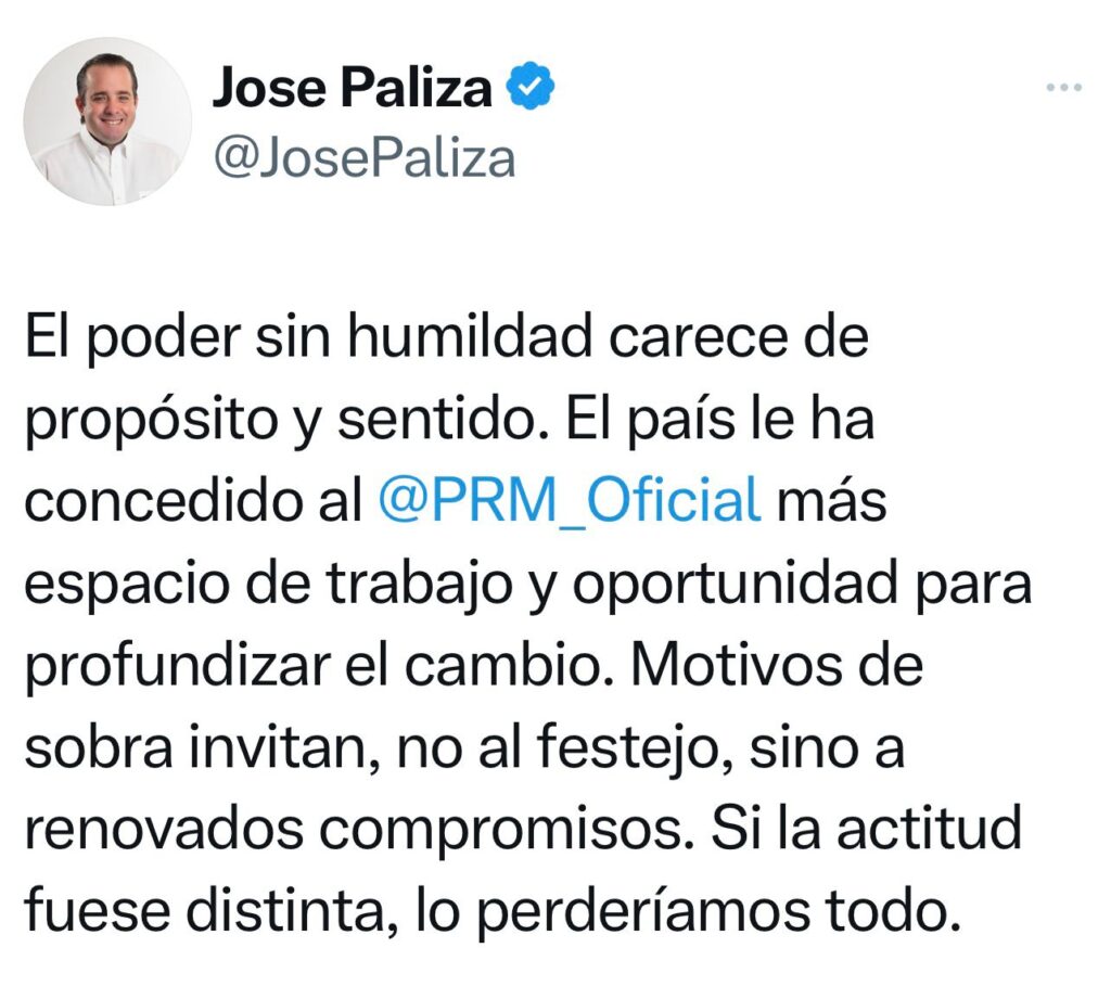Santo Domingo.- El presidente del Partido Revolucionario Moderno (PRM), José Ignacio Paliza, hizo un llamado a los miembros de esa organización política para que asuman con humildad la oportunidad que le ha concedido el país, haciendo énfasis en que el poder sin humildad carece de propósito y sentido.
