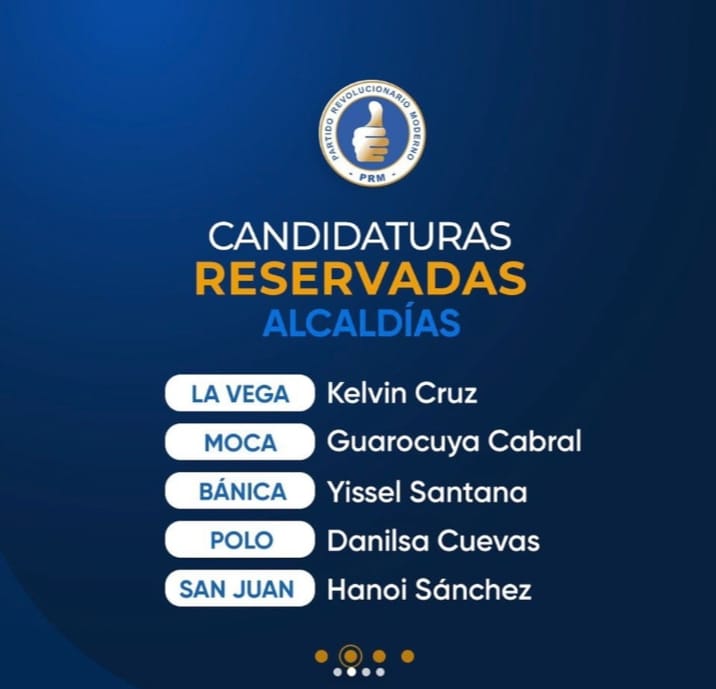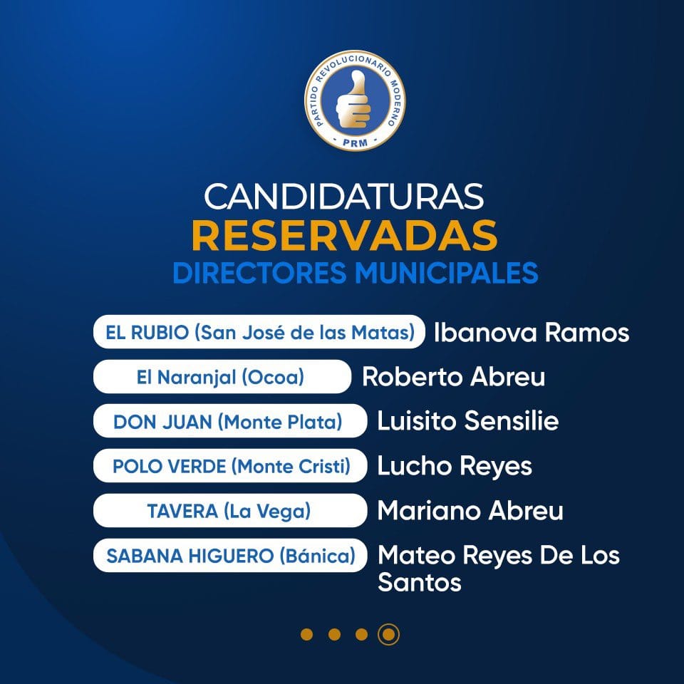 Las candituras en reservas informadas por el PRM de igual manera señalan en el Distrito Municipal Don Juan, de Monte Plata, a Luisito Sensilie, y a Kelvin Cruz, en el municipio cabecera de La Vega, en tanto que, en el Distrito Municipal El Naranjar, en San José de Ocoa, fue elegido Roberto Abreu.