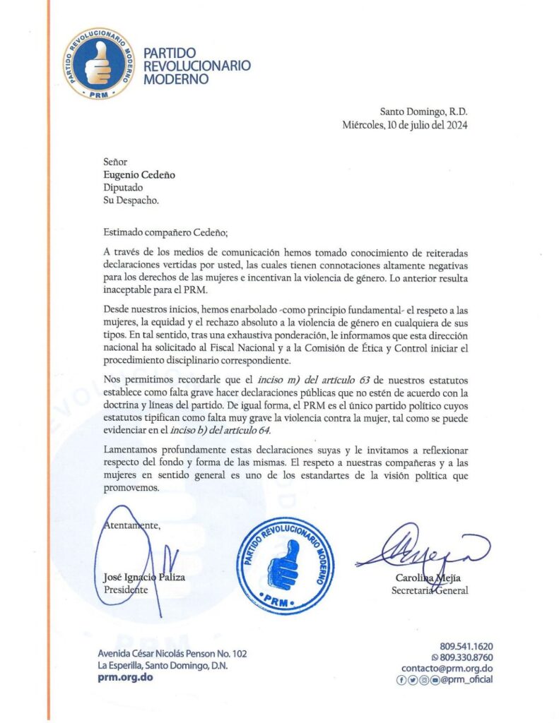 El presidente del PRM, José Ignacio Paliza, y la secretaria general, Carolina Mejía, enviaron una carta al legislador del PRM por La Romana para iniciar el proceso de sometimiento.
