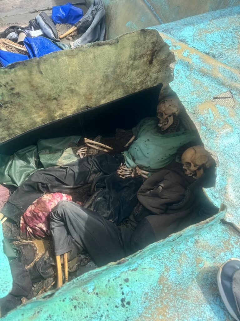 Dentro de la yola se observan varias partículas humanas, incluyendo cráneos y parte de las extremidades superiores. También se puede visualizar algunas prendas de vestir.