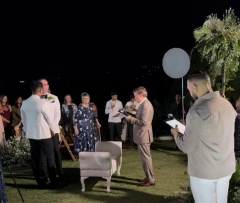 (“Fue un honor haber oficiado la boda de José Fernández y Jeremy Gottschalk en el hermoso Camp David, Santiago, República Dominicana. Una noche llena de amor, baile, grata comida dominicana, familia, amigos, fuegos artificiales y sonrisas”. Traducción libre).