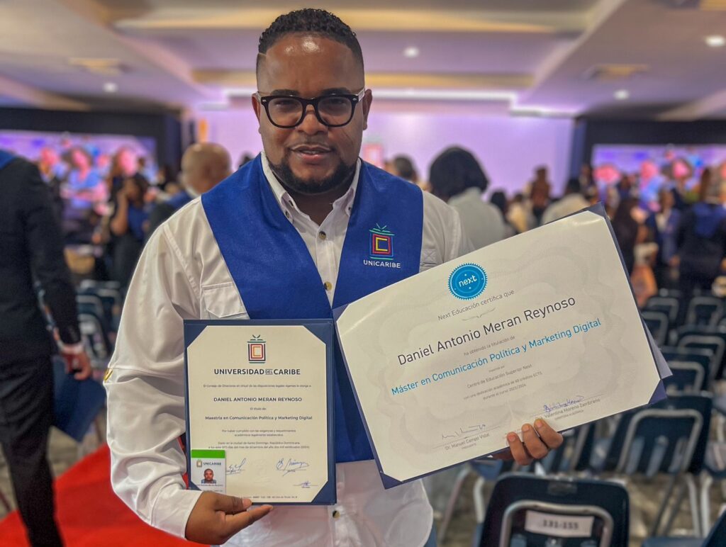 El reconocido comunicador Daniel Merán @dmnoticiasrd continúa ampliando su trayectoria profesional al completar el Máster en Comunicación Política y Marketing Digital, ofrecido por la Universidad del Caribe (Unicaribe). Este programa, el primero de su tipo en la República Dominicana, establece un hito en la formación académica del país, proporcionando herramientas especializadas para el desarrollo de estrategias efectivas en el ámbito político y digital, esenciales en la sociedad actual.