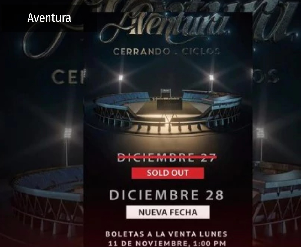 Aventura habilitó una segunda función de su concierto “Cerrando Ciclos” para el 28 de diciembre, con la venta de boletas que iniciará el próximo lunes 11 de noviembre.