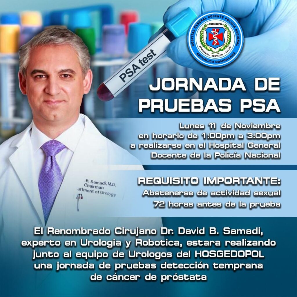 El próximo lunes 11 de noviembre, se llevará a cabo una jornada especial de pruebas PSA en el Hospital General Docente de la Policía Nacional, dirigida a la detección temprana del cáncer de próstata. La actividad se desarrollará en horario de 1:00 p.m. a 3:00 p.m. y contará con la participación del reconocido cirujano Dr. David B. Samadi, experto en urología y robótica, junto al equipo de urólogos del hospital.