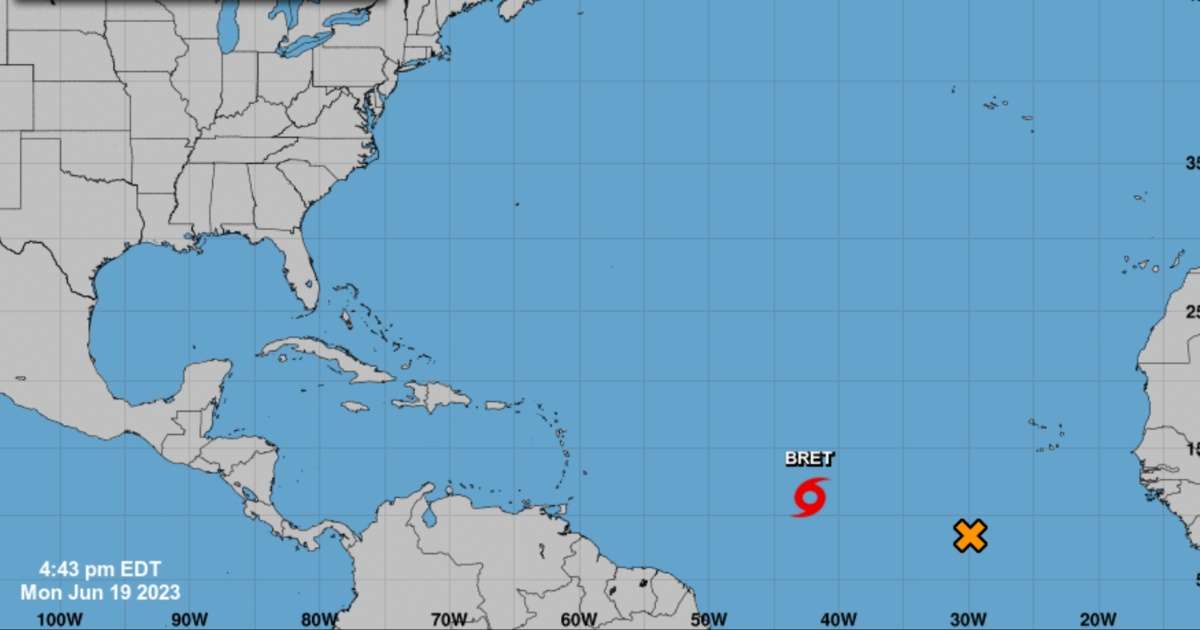 El Centro Nacional de Huracanes de Estados Unidos (NHC por sus siglas en inglés) alertó que el centro de la tormenta tropical Bret está localizado cerca de la latitud 11.3 norte, longitud 42.2 oeste y se está moviendo hacia el oeste a unos 33 kilómetros por hora (km/h).